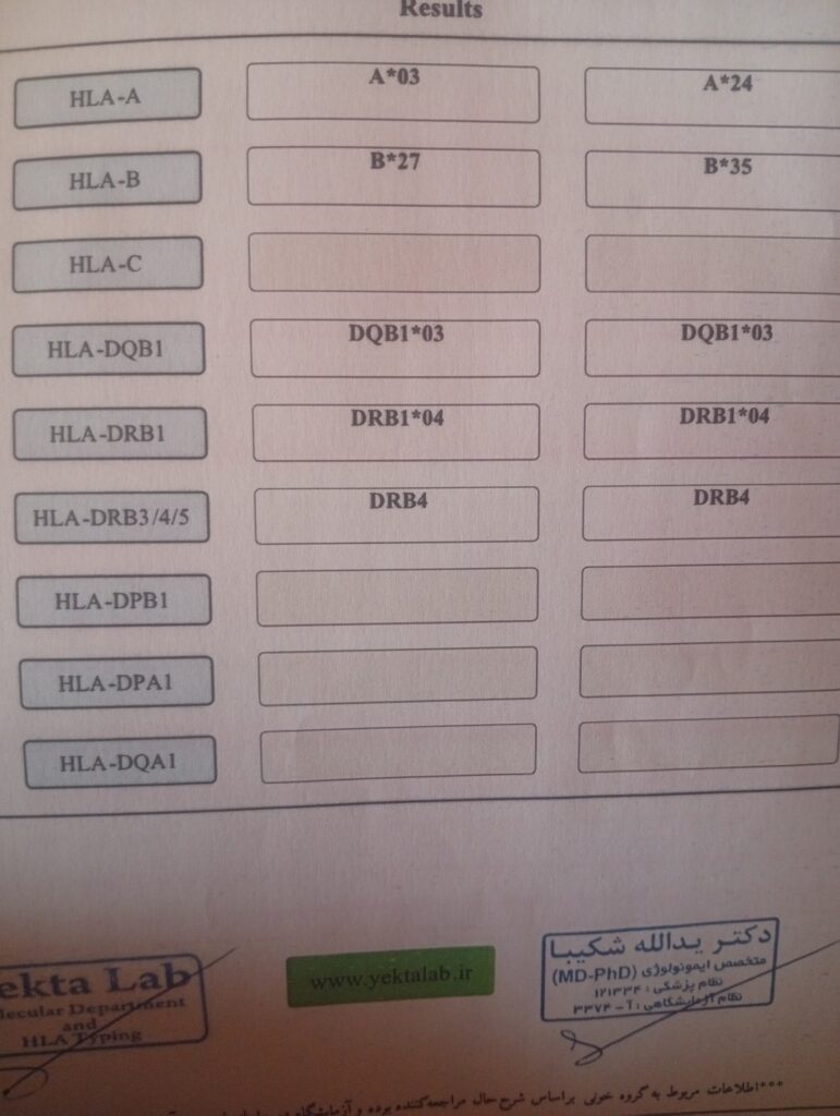 آزمایش hla انجام شده که گذاشتم، تا زمان برقراری اینترنت در ایتا یا بله پیام بدید، تلگرام و واتساپ دارم